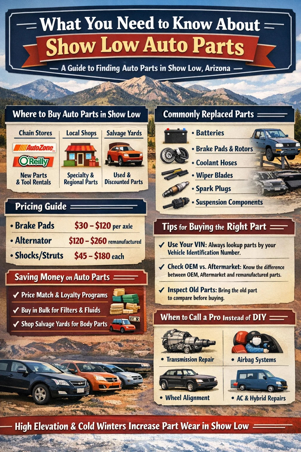 Show Low se trouve dans le comté de Navajo à une altitude d'environ 6 300 pieds, et le climat montagnard impose des exigences d'usure spécifiques aux véhicules auxquelles les conducteurs de Phoenix ou de Tucson ne sont tout simplement pas confrontés. Les démarrages à froid, le sel de déneigement lors des tempêtes hivernales et l'exposition aux UV à haute altitude accélèrent tous la dégradation des pièces. , notamment pour les composants en caoutchouc, les batteries et les systèmes de freinage. Cela signifie que les résidents d'ici remplacent certaines pièces automobiles plus fréquemment que la moyenne nationale.
