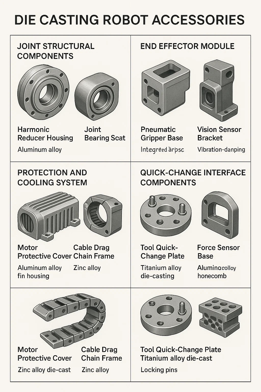 Accessoires pour robots de moulage sous pression sont des composants métalliques à noyau fabriqués selon un processus de moulage à haute pression. Ils répondent aux exigences fondamentales des robots industriels, notamment la précision, la légèreté et la durabilité. Les principales applications et fonctionnalités sont les suivantes :