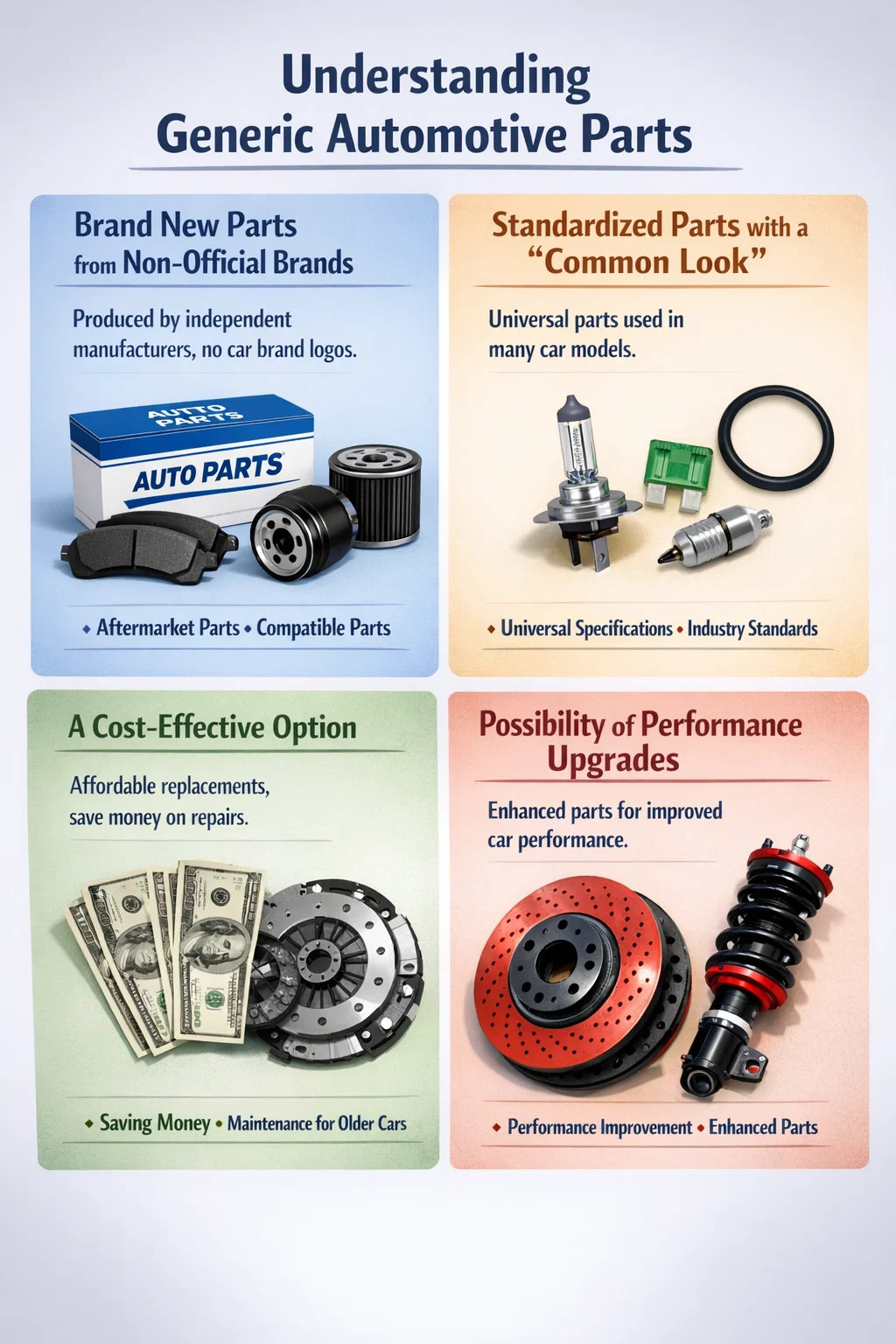 Les « pièces génériques » ou « pièces alternatives de marque » sont ce que nous appelons communément pièces automobiles qui ne sont pas directement fabriqués par le constructeur automobile mais peuvent être parfaitement installés sur la voiture. Vous pouvez les considérer comme des « médicaments génériques » dans l’industrie pharmaceutique ou des « accessoires tiers » pour les téléphones portables.