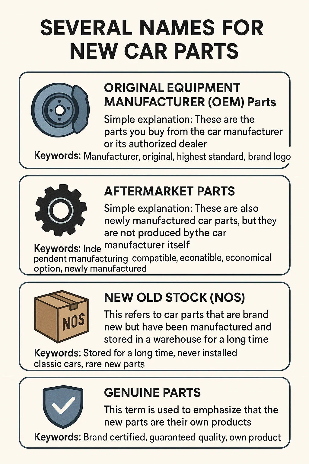 Tout neuf pièces de voiture ont plusieurs noms communs, qui diffèrent légèrement selon leur source et leur nature.